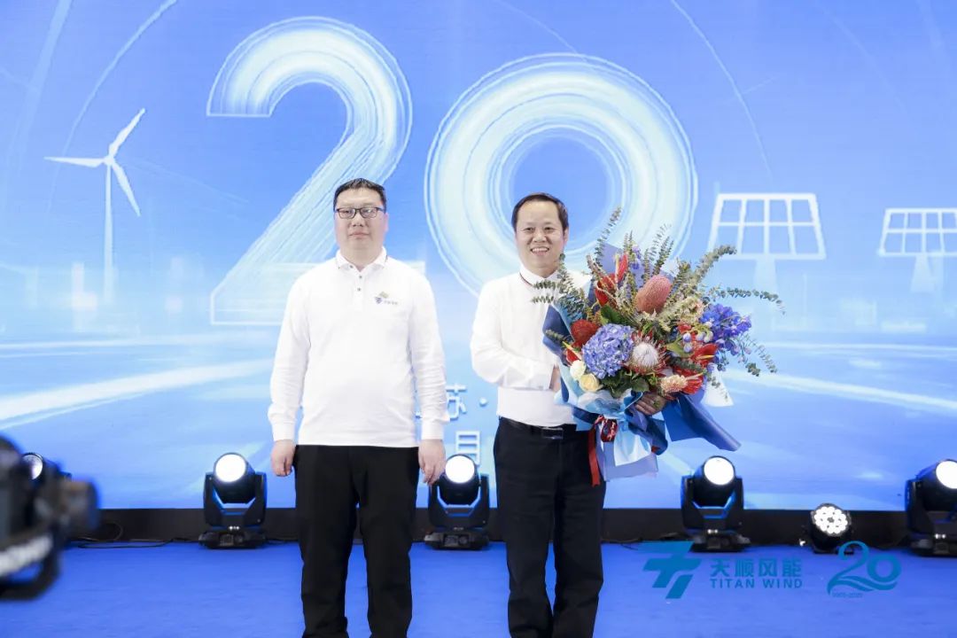而在充满温情的彩蛋环节,来自风能装备事业部的质检员刘建军,这位坚守在生产一线且司龄最长的员工,手捧鲜花,满怀敬意地献给董事长,代表全体员工表达对天顺这位“大家长”的深深感恩。