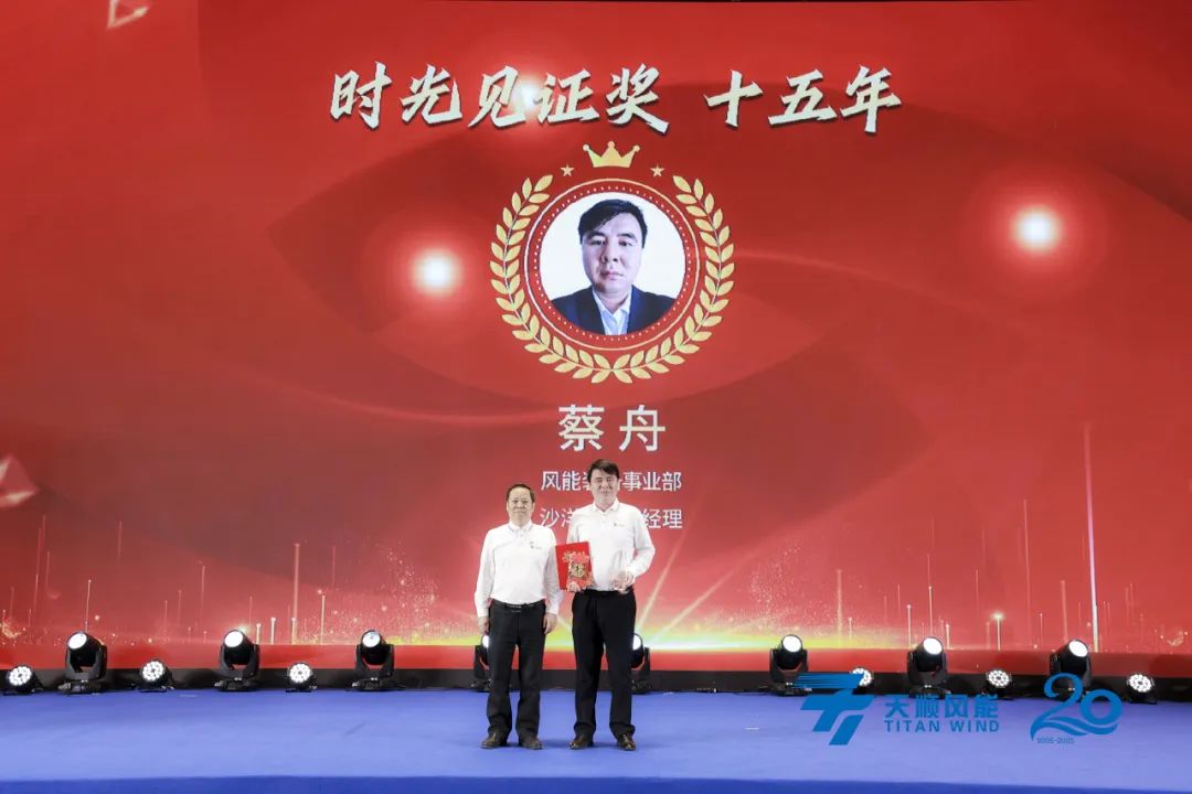 在特别致敬环节,董事长郑重地走到司龄最长的在册员工蔡舟面前,亲手为其颁发象征着荣誉与认可的奖杯和证书。
