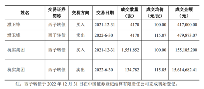 其中,杭实集团作为西子洁能持股5%以上股东,于2021年12月31日买入西子转债155.19万张,成交均价100元/张,成交金额1.55亿元;于2022年6月30日卖出西子转债13.48万张,成交均价115.85元/张,成交金额1561.47万元。前述交易构成《证券法》第四十四条规定的短线交易。濮卫锋于2021年12月31日买入西子转债4170张,成交均价100元/张,成交金额41.70万元;于2022年6月30日卖出西子转债4170张,成交均价115.07元/张,成交金额47.99万元。