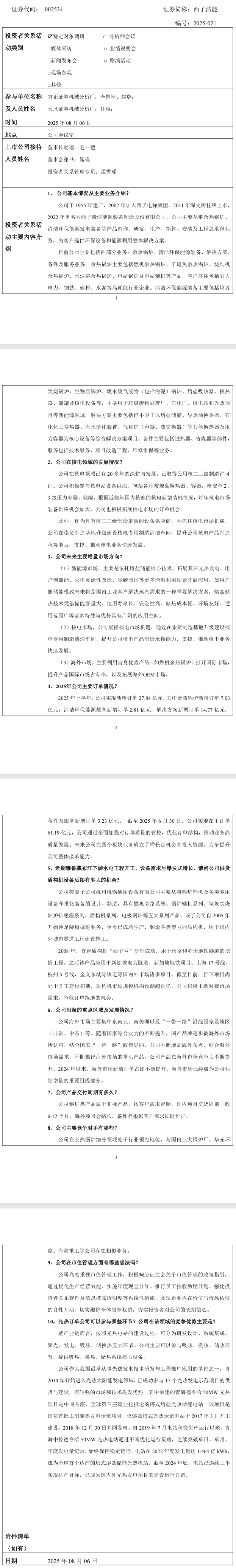 西子清洁能源装备制造股份有限公司(简称:西子洁能)近日发布投资者关系活动记录表,介绍了公司基本情况及主要业务,并披露2025年公司主要订单情况、未来主要增量市场方向等信息。