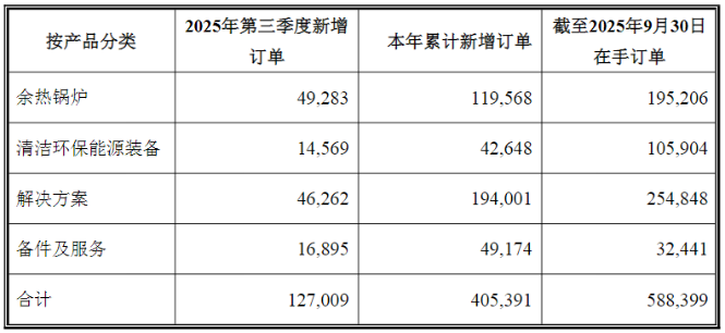 值得一提的是,新兴业务的订单增长同样面临压力。今年前三季度,清洁环保能源装备新增订单4.26亿元,解决方案新增订单19.4亿元,同比分别下滑38.96%、0.72%,两大主要板块均未实现新增订单的正向增长。仅备件及服务新增订单同比增长12.48%至4.92亿元,成为订单端为数不多的增长点。