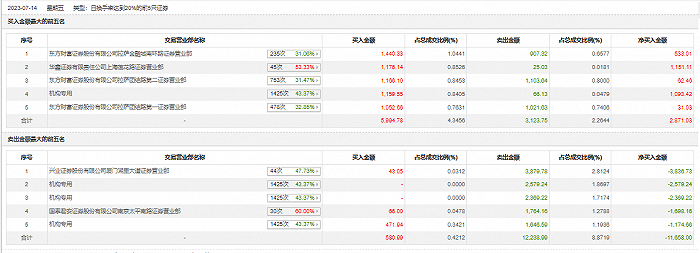 具体来看,机构买入1631.49万元,卖出6661.18万元,合计净卖出5029.69万元。此外,知名游资现身龙虎榜,兴业证券厦门湖里大道证券营业部、作手新一(国泰君安证券南京太平南路证券营业部)分别卖出3879.78万元、1764.16万元;东方财富证券拉萨金融城南环路证券营业部、华鑫证券上海莲花路证券营业部分别买入1440.33万元、1176.14万元。