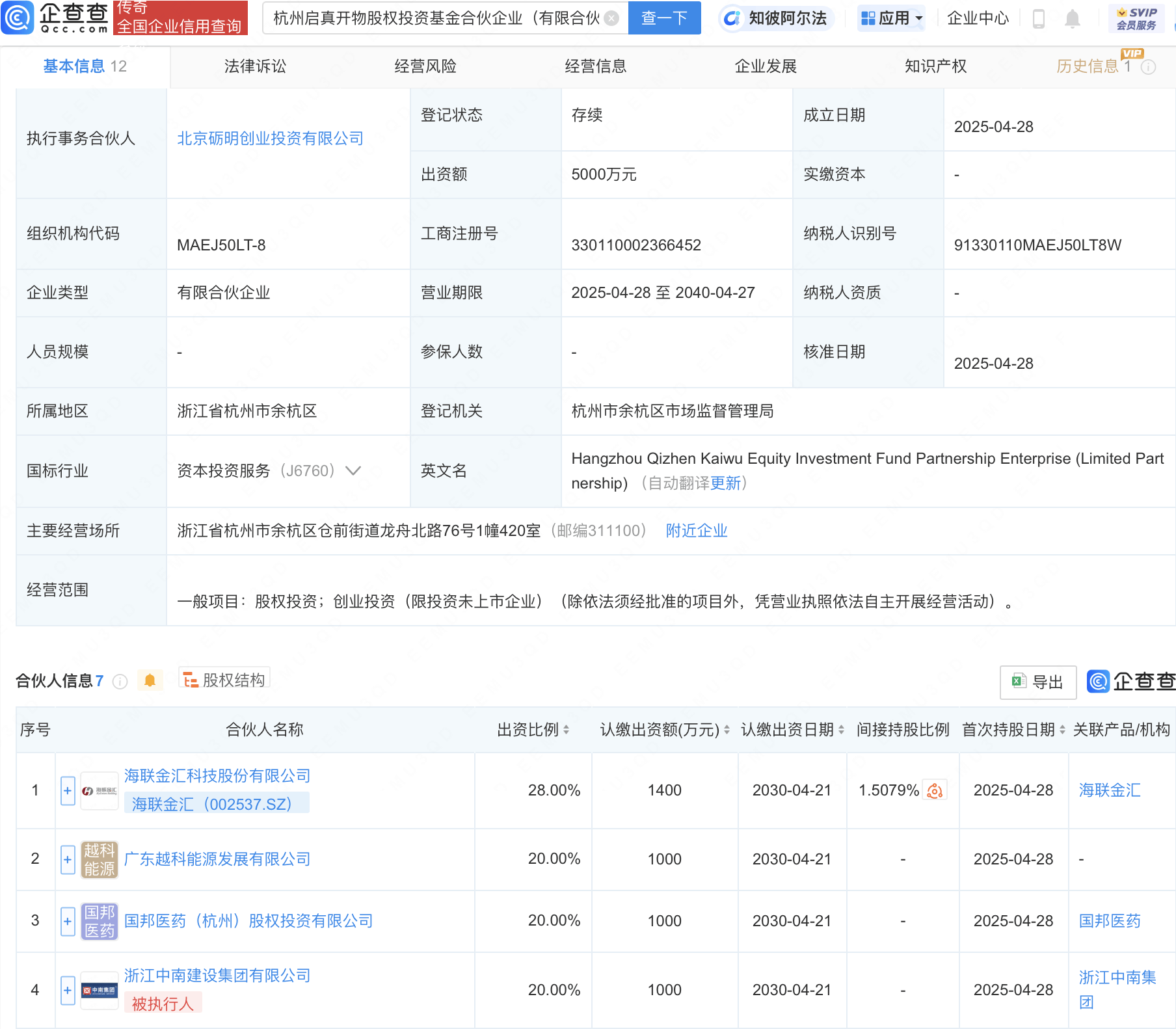 近日,杭州启真开物股权投资基金合伙企业(有限合伙)成立,出资额5000万元,经营范围包含:股权投资;创业投资(限投资未上市企业)。股权穿透显示,该企业由海联金汇(002537)等共同出资。