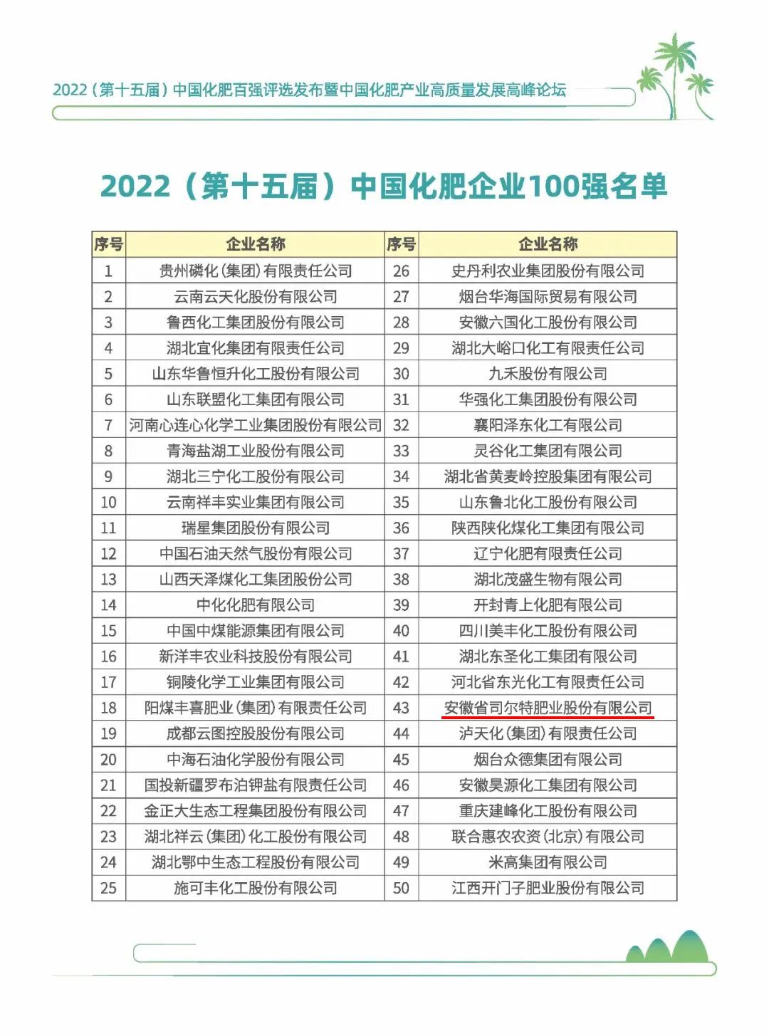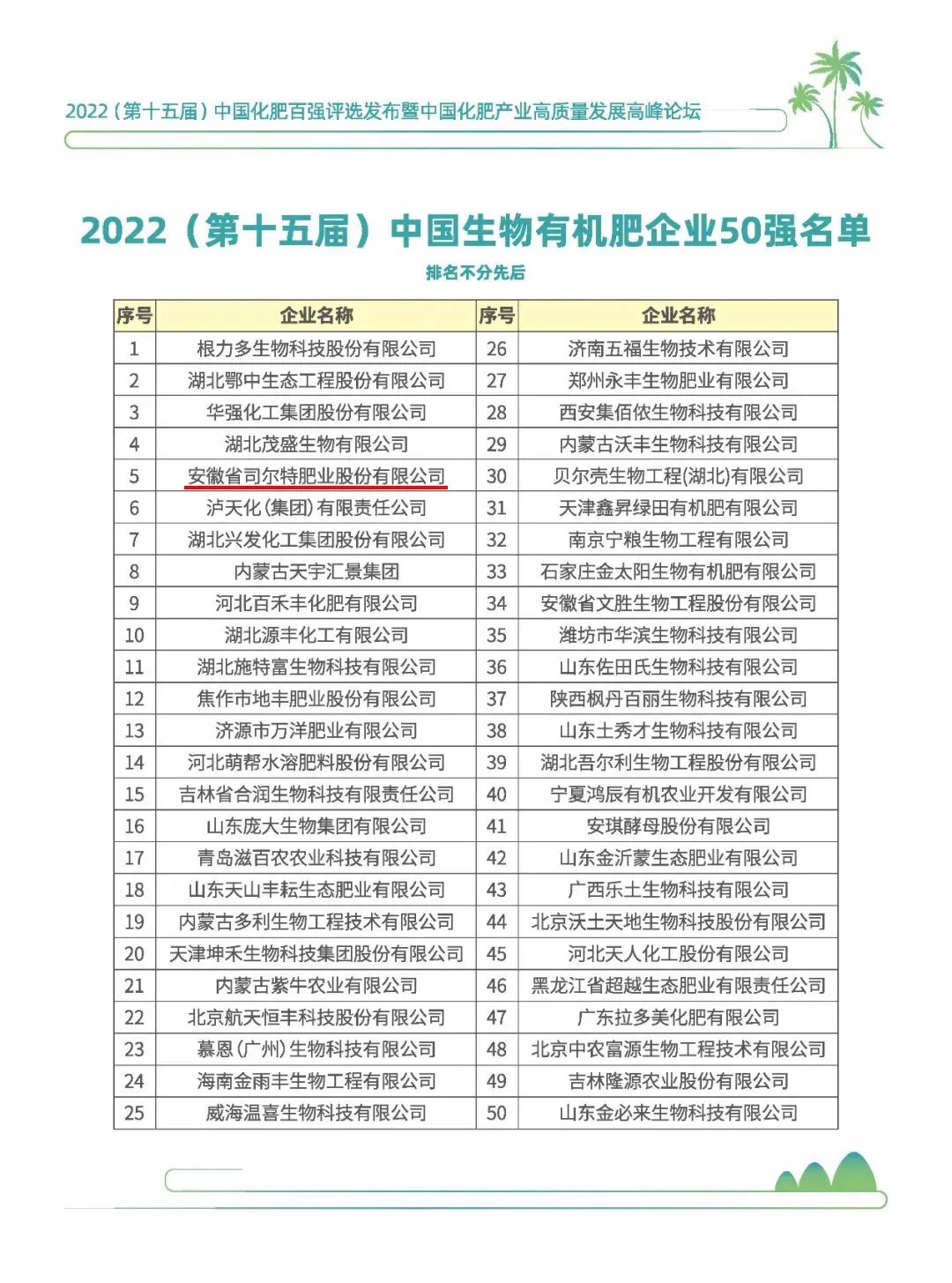 司尔特公司秉持敢为人先的创新理念,凭借雄厚的技术实力、过硬的产品质量,荣膺“2022中国化肥企业100强”“2022中国特种肥料企业50强”“2022中国生物有机肥企业50强”,彰显了司尔特公司的综合实力及行业影响力。