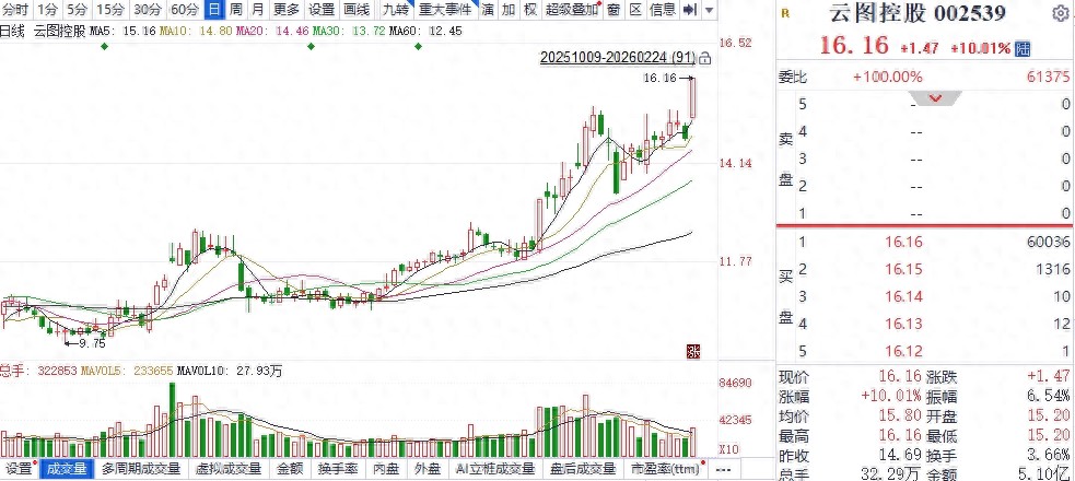 从股价运行来看,前几个交易日云图控股持续震荡,多次挑战前期高点未果,股价缩量蓄势。2月24日,该股小幅高开后快速冲高,早盘经过充分蓄力后,午后开盘不到半小时股价便被多头推升至涨停板上,收盘报16.16元。