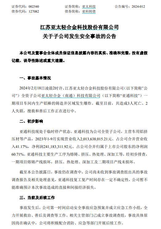 18日晚间,亚太科技发布公告,2024年2月18日凌晨2时许,公司全资子公司亚太轻合金(南通)科技有限公司(以下简称“亚通科技”)一期项目车间内生产铝棒的铸造井区域发生爆炸。截至目前,共造成3人死亡、2人失联,搜救和善后工作正在进行中。