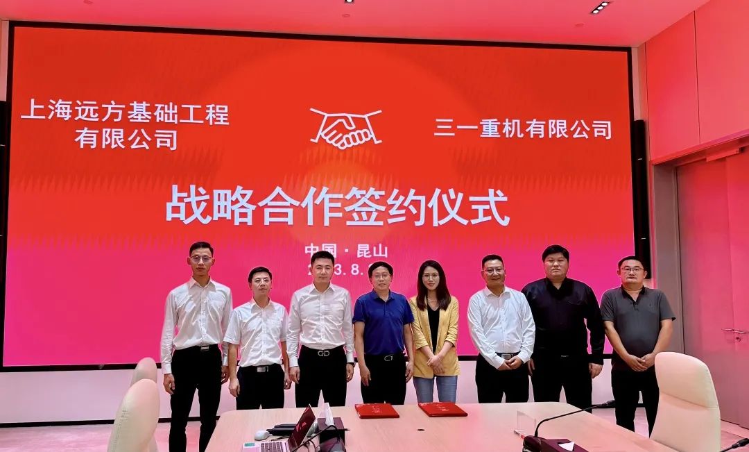 2023年8月29日,中化岩土集团全资子公司上海远方与三一重机有限公司(以下简称“三一重机”)在昆山市举行战略合作签约仪式,签署战略合作协议,达成携手共拓海外基建市场的合作意向。上海远方董事长刘忠池、总经理助理冯国卫、海外项目负责人袁兆阳,三一重机海外事业部常务副总经理王龙刚、海外事业部副总经理王菁柏、桩工研究院副院长张祖林、桩工事业部营销总监崔蓓、海外事业部马来西亚营销总监邵嘉坤出席会议。