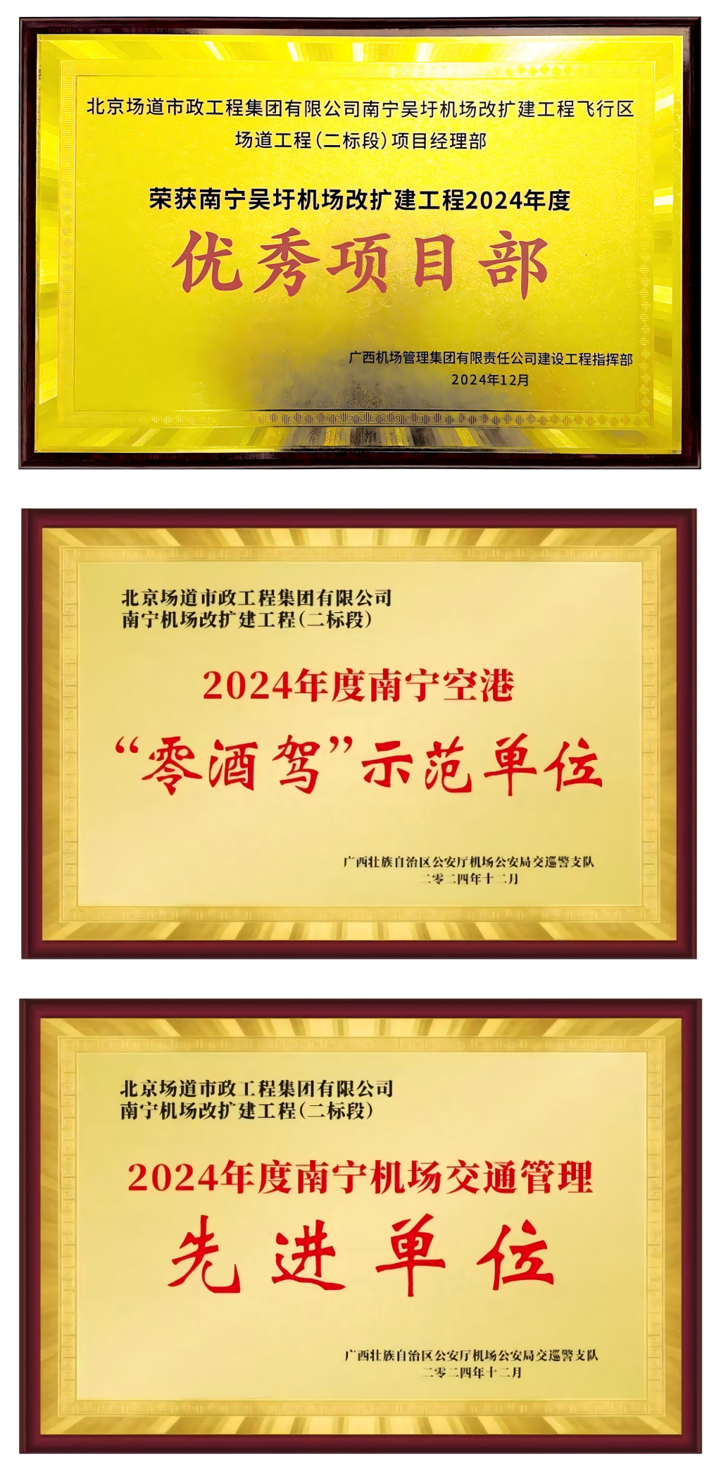 近日,中化岩土集团所属北京场道市政工程集团有限公司(以下简称“北京场道”)承建的南宁吴圩机场改扩建工程飞行区场道工程(二标段)项目,荣获广西机场管理集团有限责任公司建设工程指挥部授予的“优秀项目部”荣誉称号。同时,也获得了广西壮族自治区公安厅机场公安局交巡警支队颁发的“2024年度南宁空港‘零酒驾’示范单位”、“2024年度南宁机场交通管理先进单位”荣誉。