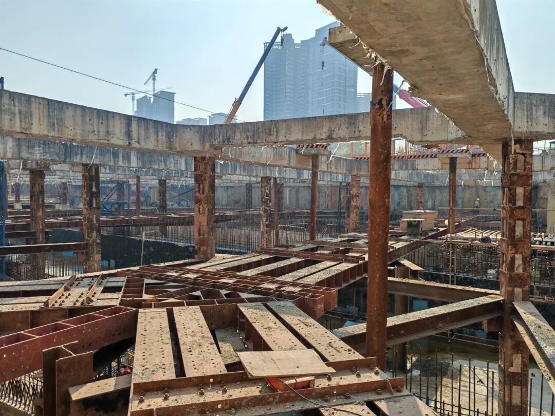 目前,基坑钢支撑拆除工作正有序推进,整体拆撑进度可控,已完成绝大部分区域钢支撑拆除任务,仅剩最后一层钢支撑在局部区域尚未拆除。现场严格按照专项施工方案组织实施,持续加强监测与巡查,确保拆撑过程安全平稳。