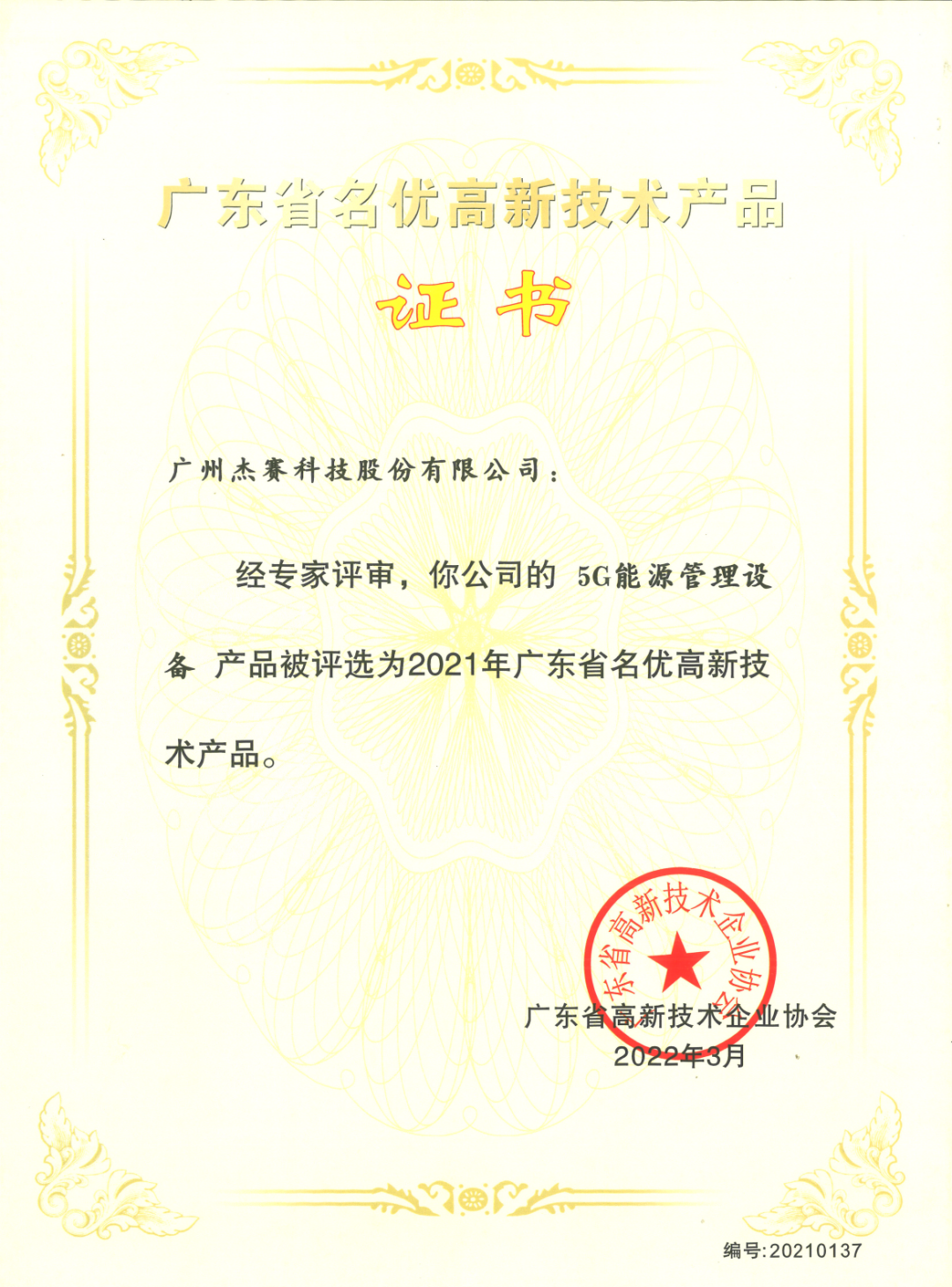 近日,广东省高新技术企业协会正式公布了《2021年广东省名优高新技术产品名单》,杰赛科技自主研发的5G能源管理设备产品被评为2021年广东省名优高新技术产品。
