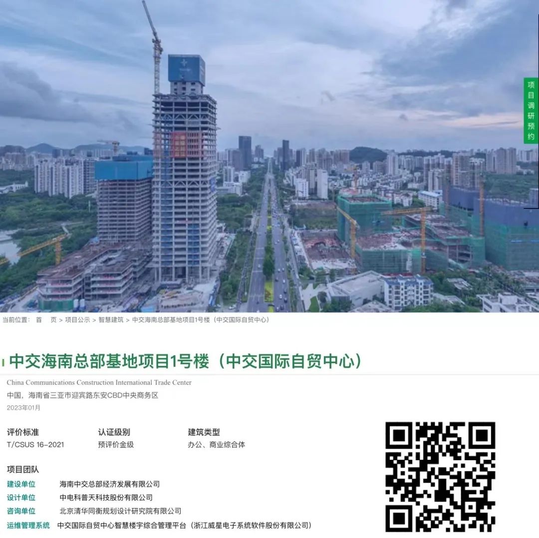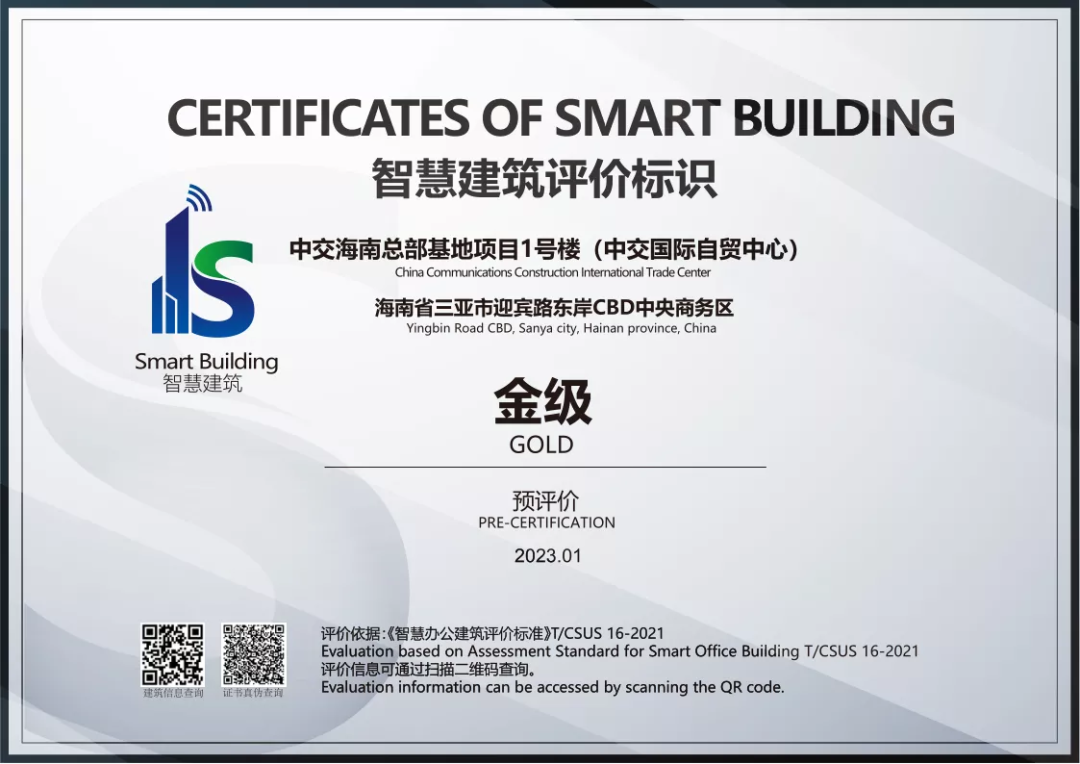 近日,中国城市科学研究会颁发了全国第一批(首批入选仅7个项目)智慧建筑评价标识,由普天科技负责建筑智能化设计的中交海南总部基地项目1号楼(中交国际自贸中心)获评预评价金级认证。