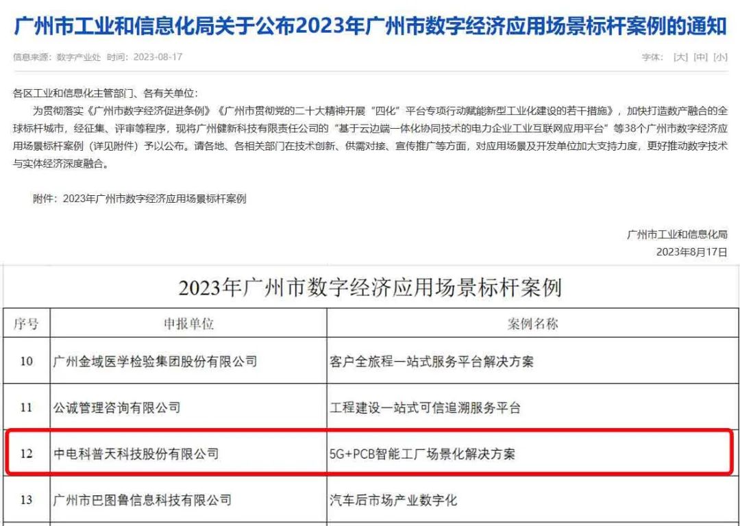 近日,广州市工业和信息化局正式公布了《2023年广州市数字经济应用场景标杆案例》名单,普天科技“5G+PCB智能工厂场景化解决方案”成功入选,据悉全市有38个案例入选。