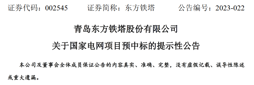 东方铁塔(002545)于5月4日发布公告称,2023年4月28日,国家电网公司电子商务平台(http://ecp.sgcc.com.cn)公布了《国家电网有限公司2023年第二十三批采购(输变电项目第二次线路装置性材料招标采购)推荐的中标候选人公示》及《国家电网有限公司2023年第二十八批采购(特高压项目第二次设备招标采购)推荐的中标候选人公示》,青岛东方铁塔股份有限公司合计预中标约24,732.28万元,约占公司2022年经审计的营业收入的6.84%。现将相关情况提示公告如下: