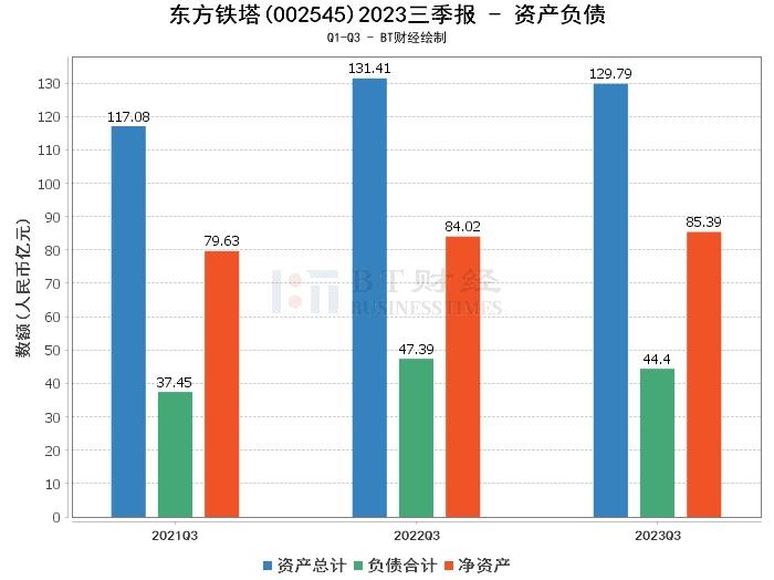 从资产负债方面来看,东方铁塔2023年三季度的总资产为129.79亿元,相比上年度末的130.36亿元略有下降。负债总额为44.4亿元,相比上年度末的45.68亿元有所减少。净资产为85.39亿元,略高于上年度末的84.68亿元。资产负债率为34.21%,较上年度末的35.04%有所下降。这表明公司的负债状况有所改善,财务结构更加稳健。
