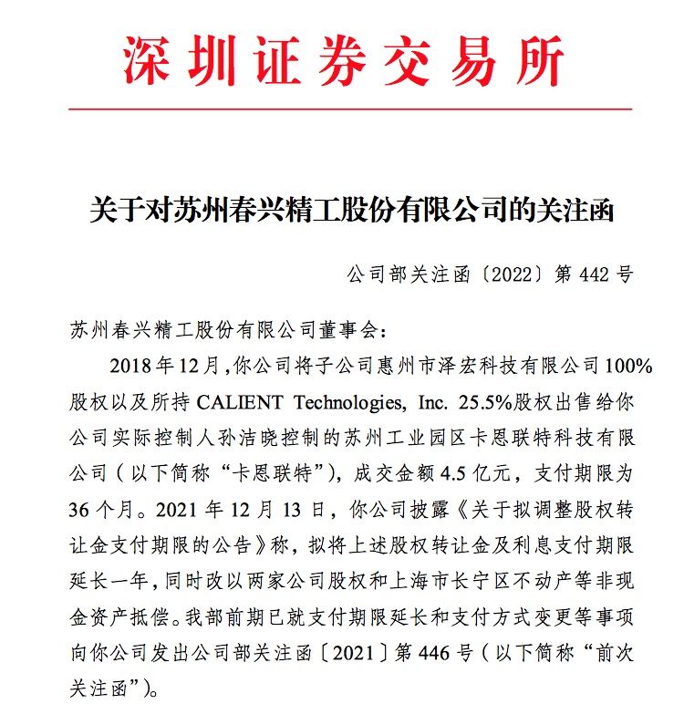 2018 年12月,春兴精工将子公司惠州市泽宏科技有限公司 100%股权以及所持 CALIENT Technologies, Inc. 25.5%股权出售给公司实际控制人孙洁晓控制的苏州工业园区卡恩联特,成交金额 4.5 亿元,支付期限为36个月。2021年12月13日,公司披露公告称,拟将上述股权转让金及利息支付期限延长一年,同时改以两家公司股权和上海市长宁区不动产等非现金资产抵偿。