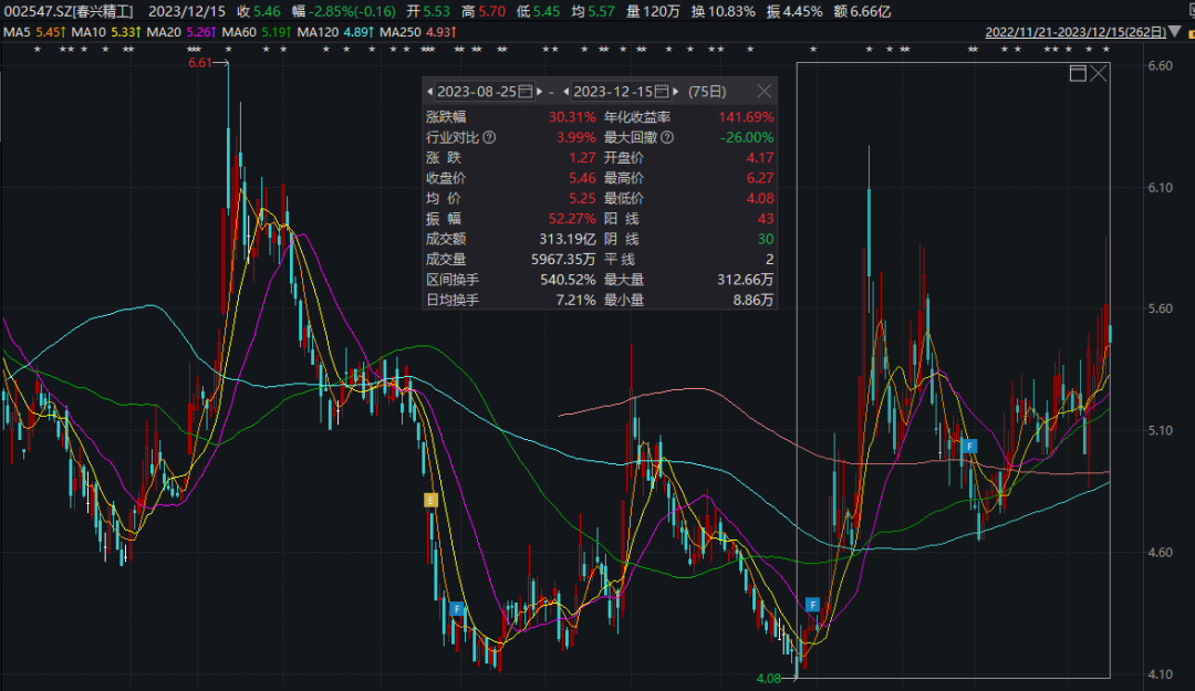 受益于近期汽车零部件板块表现较好,春兴精工8月25日以来累计涨超30%,当前总市值为62亿元。