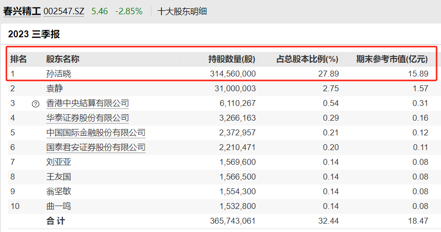 截至今年三季度末,孙洁晓为春兴精工的第一大股东,持股数量3.15亿股,持股占比27.89%,期末参考市值为15.89亿元。