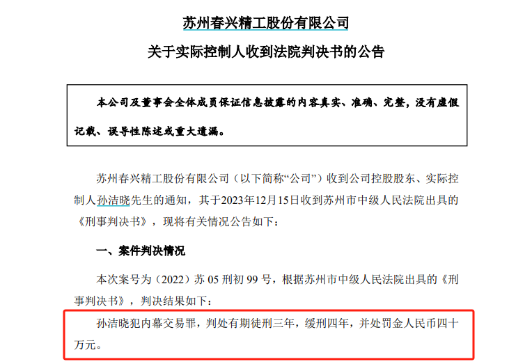 12月15日晚间,春兴精工发布公告称,公司收到控股股东、实际控制人孙洁晓先生的通知,其于2023年12月15日收到苏州市中级人民法院出具的《刑事判决书》。