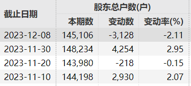 截至2023年12月8日,公司股东数为14.51万户。