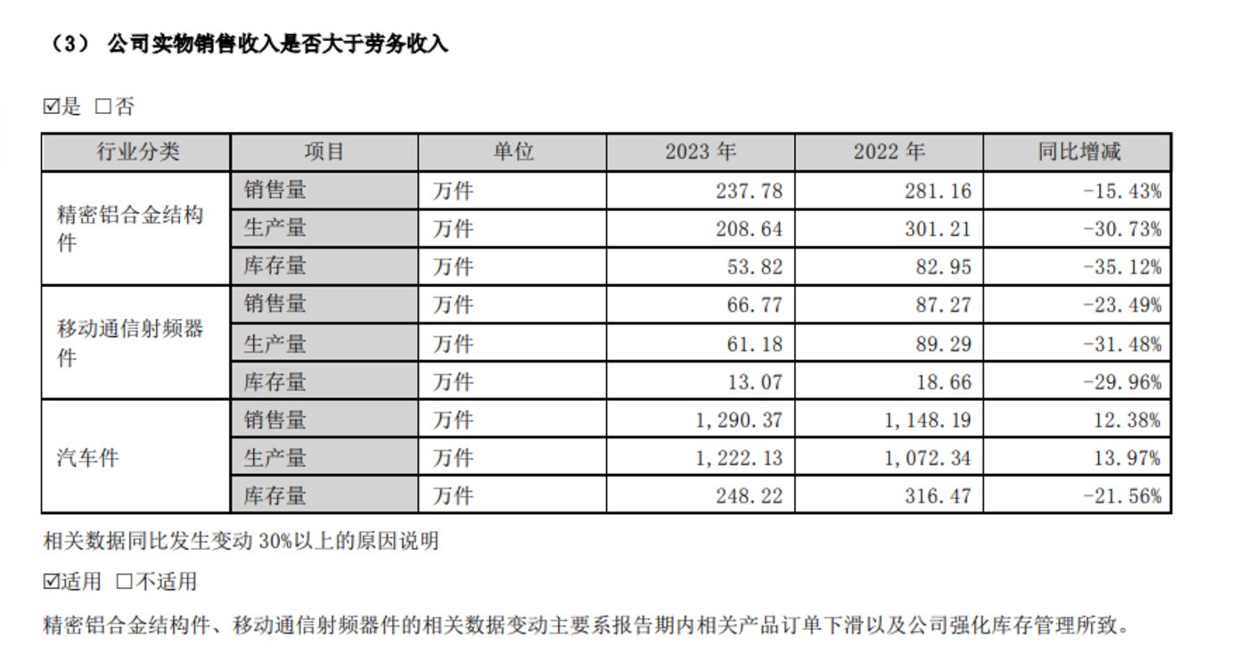 另外,从公司的实物销量也可以看出,其精密铝合金结构件以及移动通信射频器件的销量和生产量均呈现两位数下滑。精密铝合金结构件的销量和生产量分别下滑15.43%和30.73%;移动通信射频器件的销量和生产量分别下滑23.29%和31.48%;唯独汽车件销量和生产量分别增加12.38%和13.97%,可见,汽车件业务已经成为公司的业绩支撑点。