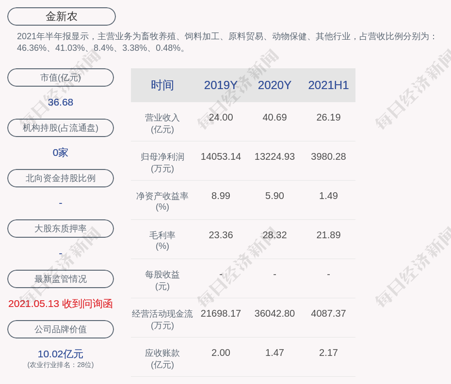 2021年半年报显示,金新农的主营业务为畜牧养殖、饲料加工、原料贸易、动物保健、其他行业,占营收比例分别为:46.36%、41.03%、8.4%、3.38%、0.48%。