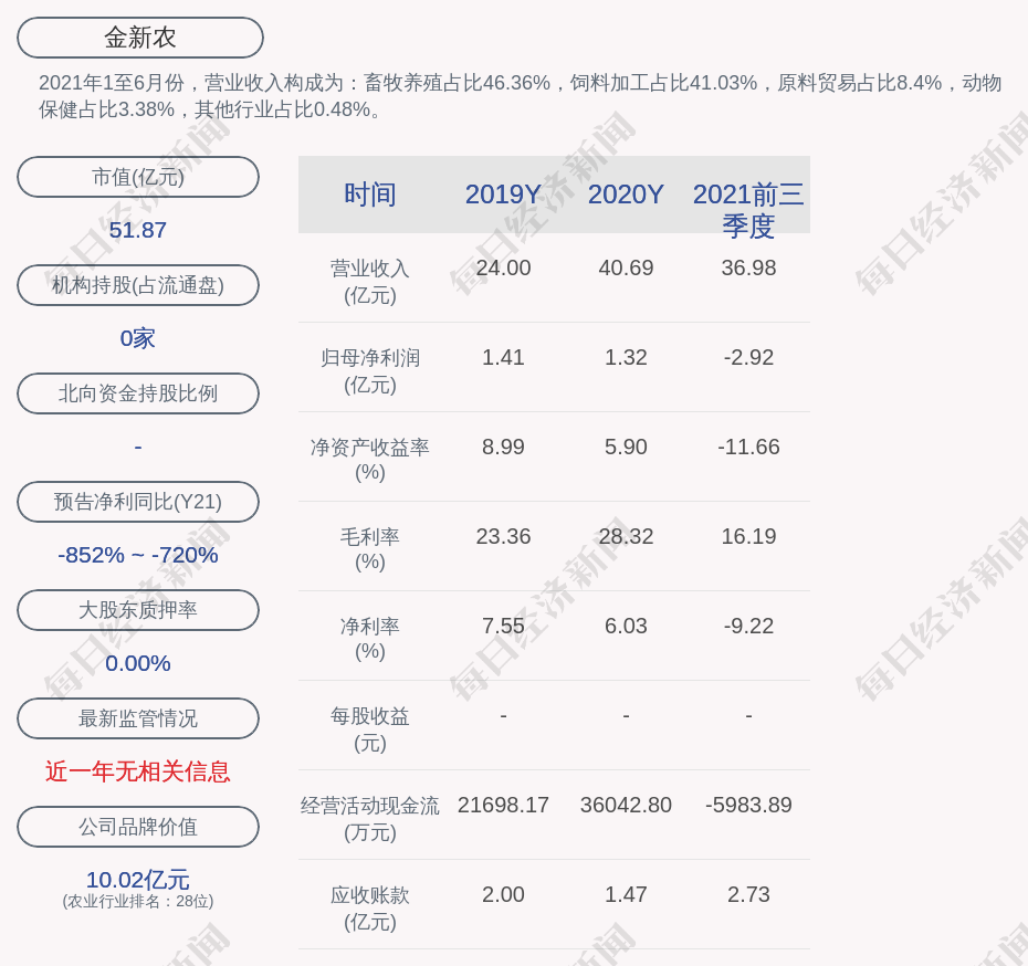 2021年1至6月份,金新农的营业收入构成为:畜牧养殖占比46.36%,饲料加工占比41.03%,原料贸易占比8.4%,动物保健占比3.38%,其他行业占比0.48%。