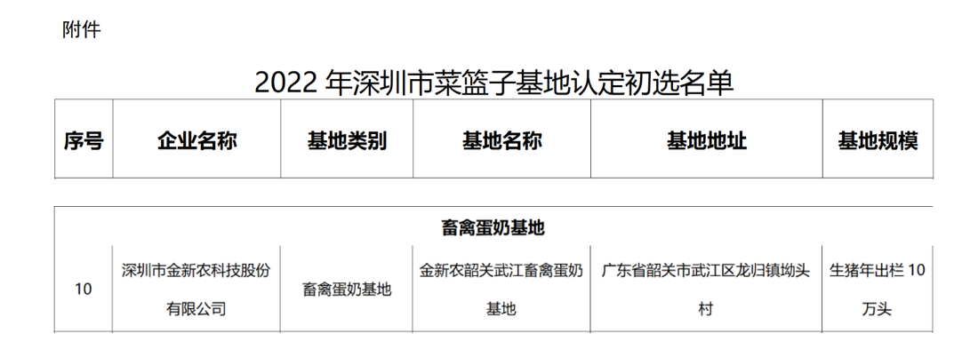 2022年12月7日,深圳市市场监督管理局发布了《关于公示2021年深圳市菜篮子基地认定初选名单的通知》,金新农旗下韶关市武江区优百特养殖有限公司(以下简称武江优百特)生猪养殖基地入选2022年深圳市菜篮子基地认定初选名单。