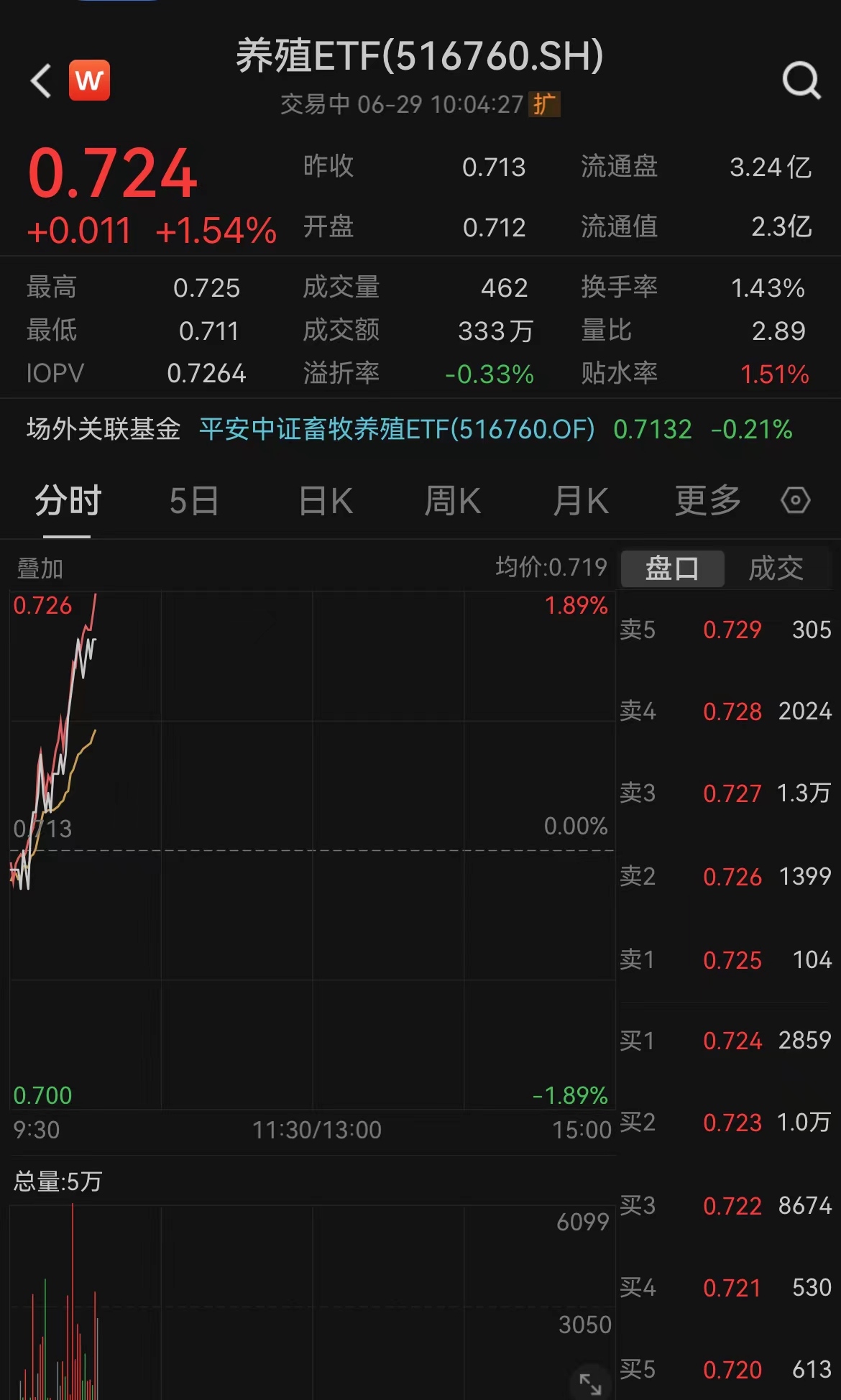 截至2023年6月29日10:02,中证畜牧养殖指数(930707)强势上涨1.54%,成分股金新农(002548)上涨5.65%,新五丰(600975)上涨4.05%,温氏股份(300498)上涨3.82%,巨星农牧(603477),唐人神(002567)等个股跟涨。养殖ETF(516760)上涨1.54%,最新价报0.72元,成交放量。