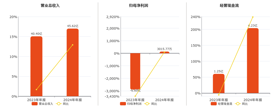 公司营业总收入为45.62亿元。归母净利润为3015.77万元。经营活动现金净流入为4.23亿元。