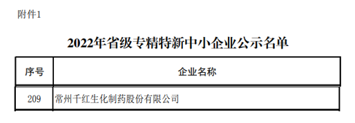 2022年11月15日,常州市工业和信息化局发布了《江苏省2022年专精特新中小企业和2019年度专精特新企业复核通过企业名单的公示》,常州千红生化制药股份有限公司首次被认定为省级专精特新企业。
