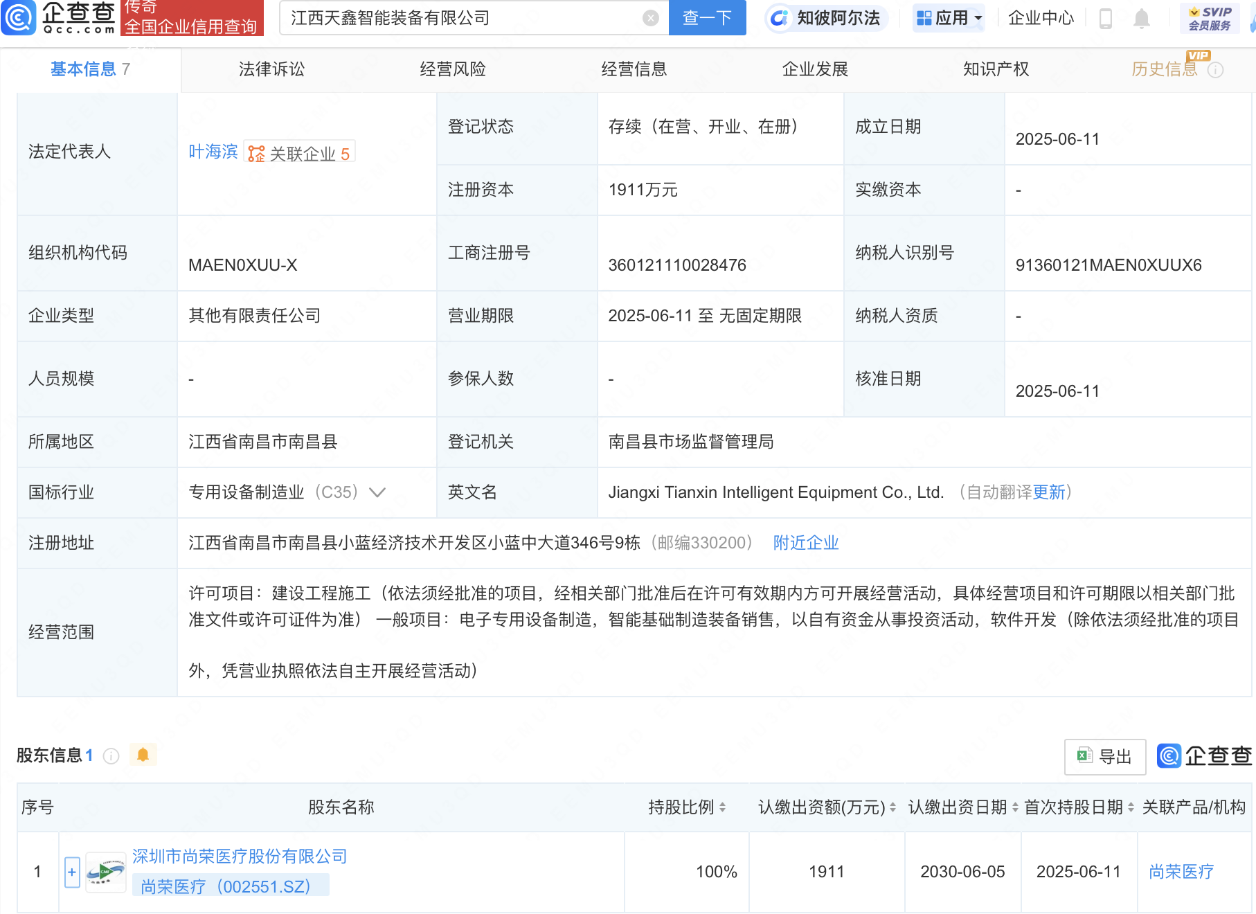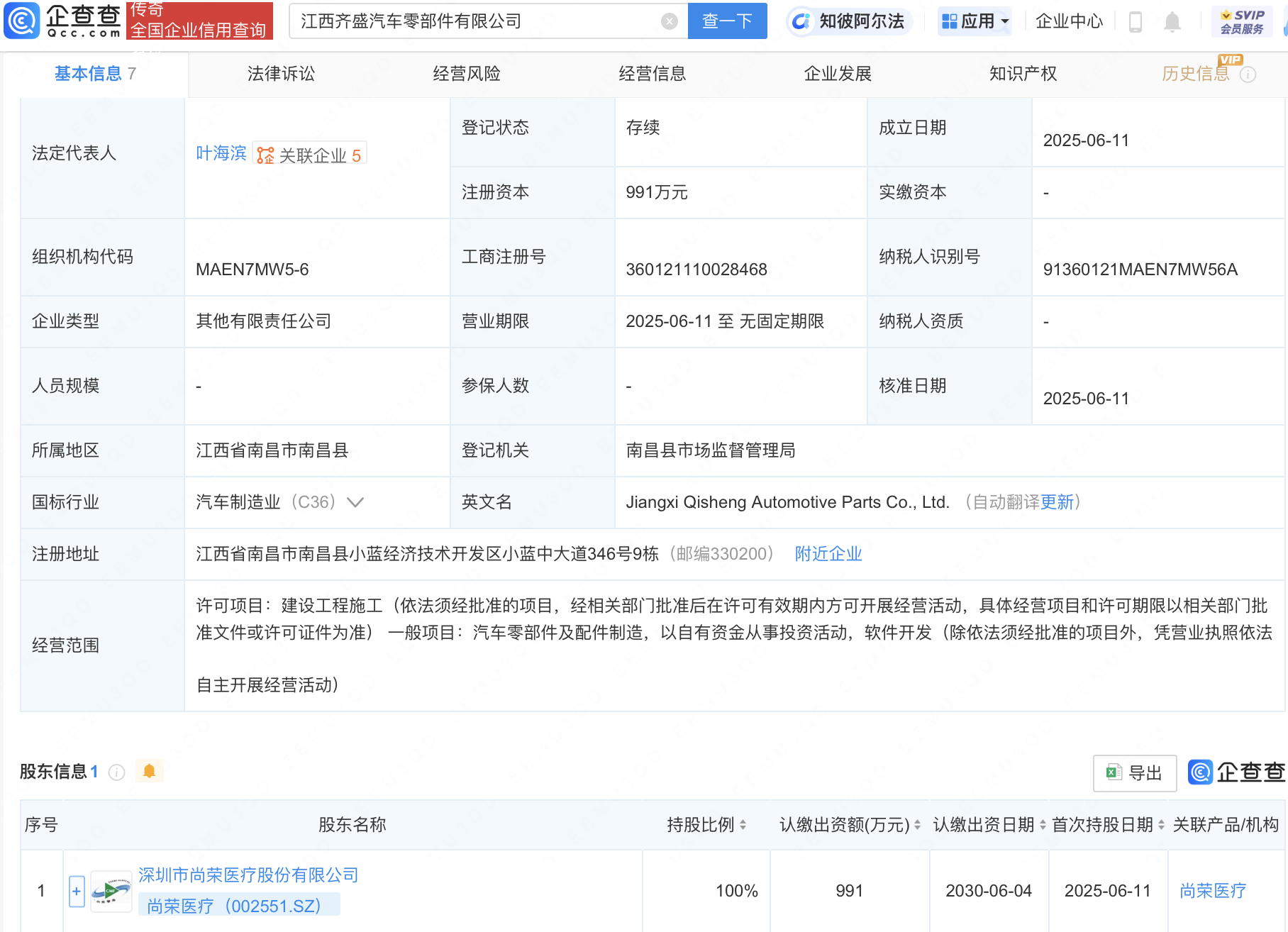 企查查APP显示,近日,江西齐盛汽车零部件有限公司、江西天鑫智能装备有限公司成立,法定代表人同为叶海滨。企查查股权穿透显示,二者皆由尚荣医疗(002551)全资持股。