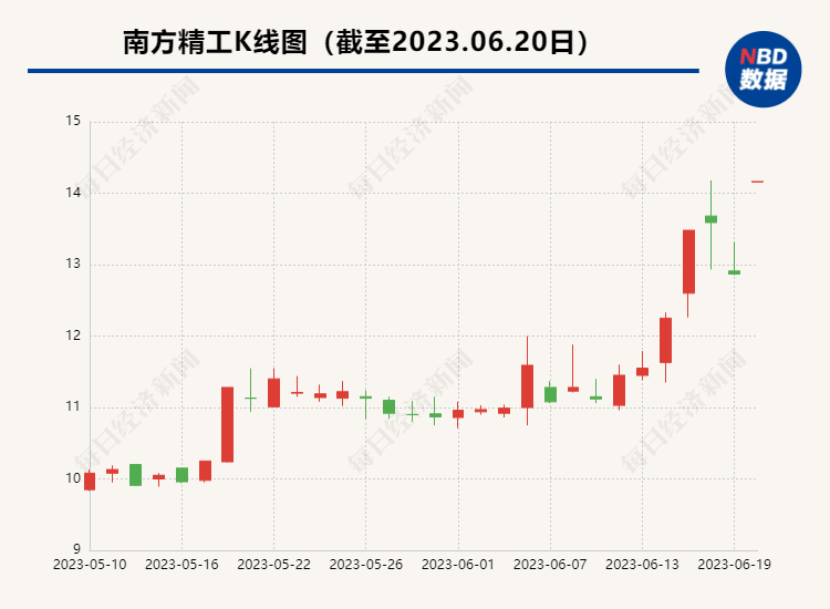 6月20日,南方精工(SZ002553,股价14.16元,市值49.28亿元)一字涨停。