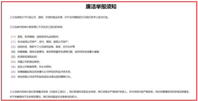 值得注意的是,三七互娱在今年4月份左右上线了廉洁举报平台,公司内外人士均可在其中举报自己发现的不法行为,主要包括收受贿赂、利用职权谋私、泄露公司商业秘密等9项。