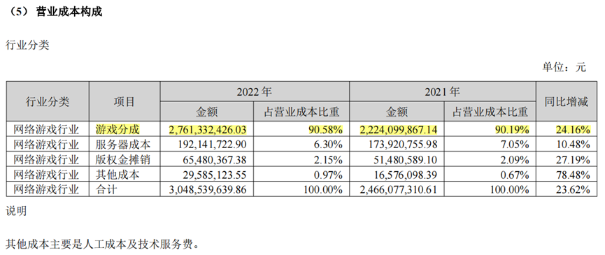 毛利率下滑主要源于营业成本中的“游戏分成”暴增,该数据由2021年的22.24亿大幅增至2022年的27.61亿,同比增长24.16%。三七互娱表示,“游戏分成”主要是给游戏研发商及IP提供商的分成。