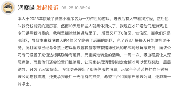 此外,由于有些游戏的玩家数量不多,官方会雇很多ldquo;陪玩rdquo;,并通过分享经验后诱导玩家充值的现象。在三七互娱旗下《一刀传世》游戏中,有玩家反映前期被游戏托诱导充值,并在官方推出ldquo;四倍区rdquo;福利充值了近三万元,但不到一年时间游戏又陆续推出ldquo;六倍区rdquo;ldquo;八倍区rdquo;和ldquo;十倍区rdquo;等福利吸引新玩家,游戏环境变得极不公平。