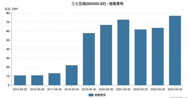重金买量之下,三七互娱的销售费用目前已攀升至高点。今年前三季度,公司的销售费用为77.04亿元,同比增长21.11%,创上市以来同期历史新高。其中,Q3的销售费用则同比增长12.59%,为23.43亿元。
