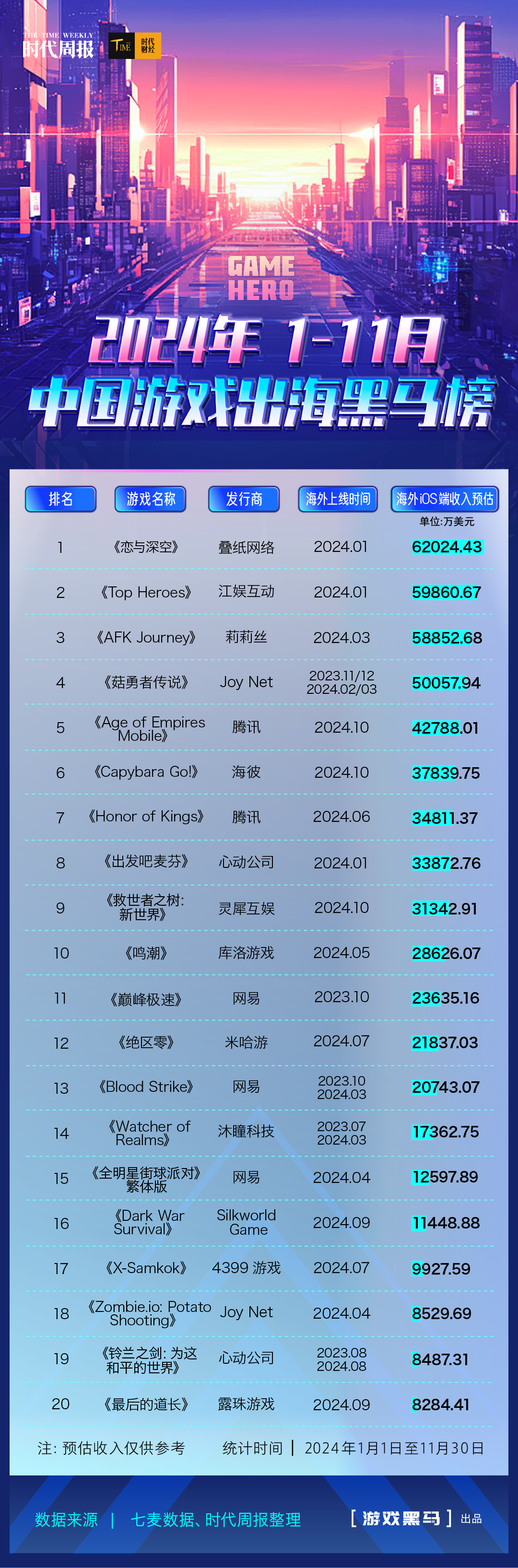 据时代周报发布的《2024年1-11月中国游戏出海黑马榜》,今年以来,多款轻度休闲游戏异军突起,成为游戏出海领域爆款品类。