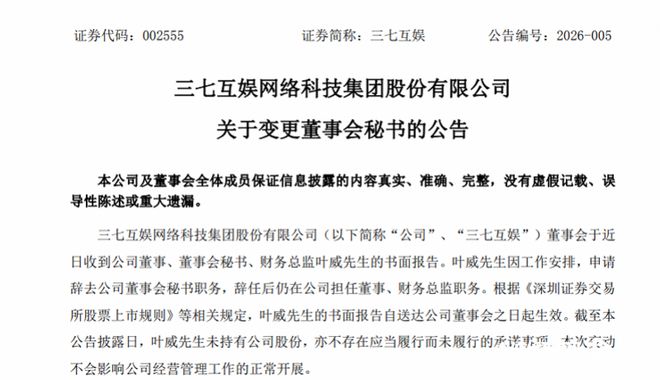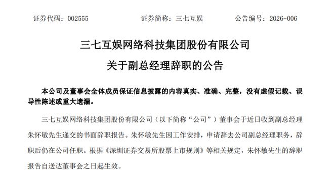 根据公告,公司董事会秘书叶威申请辞去三七互娱董事会秘书职务,辞任后仍担任董事、财务总监职务;朱怀敏申请辞去公司副总经理职务,辞任后仍在公司任职。