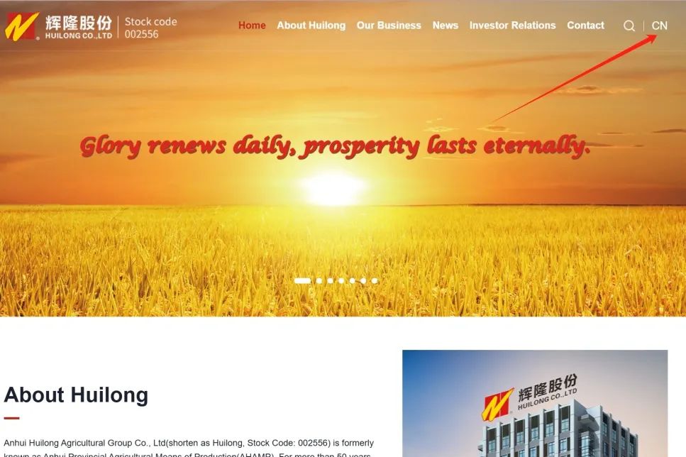 (进入辉隆股份英文官网(PC端)后,点击右上角“CN”可切换进入中文官网。)
