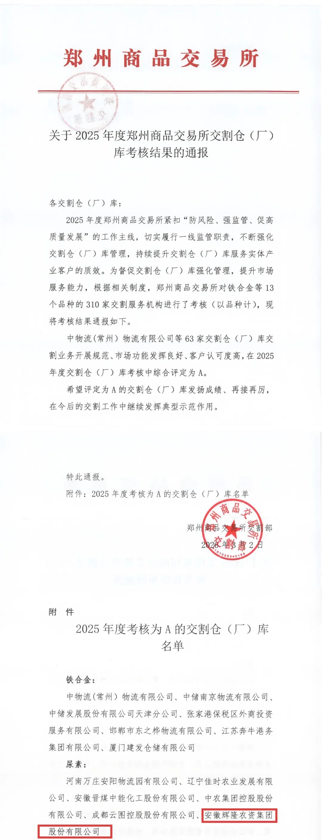 近日,郑州商品交易所(以下简称“郑商所”)正式发布《关于2025年度郑州商品交易所交割仓(厂)库考核结果的通报》,辉隆股份因在尿素期货交割业务中运营规范、客户服务优质、市场功能发挥突出,荣获综合考核A级评价,这一结果充分体现了辉隆股份在期货交割领域的专业实力和行业示范作用。