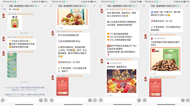 洽洽的企微社群都是以洽洽吃货小分队来命名的,它是洽洽在私域流量中重点关注的一环,除了小分队,洽洽还成立了宠粉福利群,虽然福利看起来诱惑性更大一些,但实际上小分队在增粉速度和活跃度上都更胜一筹。