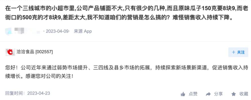 深交所互动易平台上,一位投资者表示:“洽洽瓜子在一个三线城市的小超市里,公司产品铺面不大,只有很少的几种,而且原味瓜子150克要8块9,而老街口的500克的才8块9,差距太大,我不知道咱们的营销是怎么搞的?难怪销售收入持续下降”。