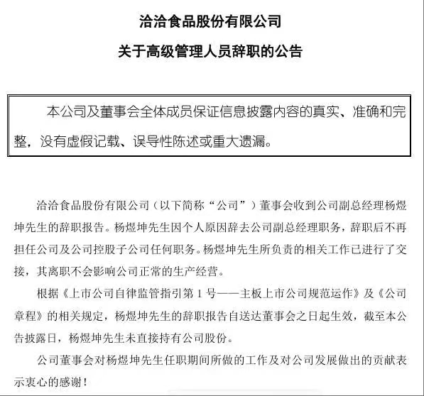 4月30日,洽洽食品(002557)公告,公司董事会收到公司副总经理杨煜坤的辞职报告。杨煜坤因个人原因辞去公司副总经理职务,辞职后不再担任公司及公司控股子公司任何职务。杨煜坤所负责的相关工作已进行了交接,其离职不会影响公司正常的生产经营。
