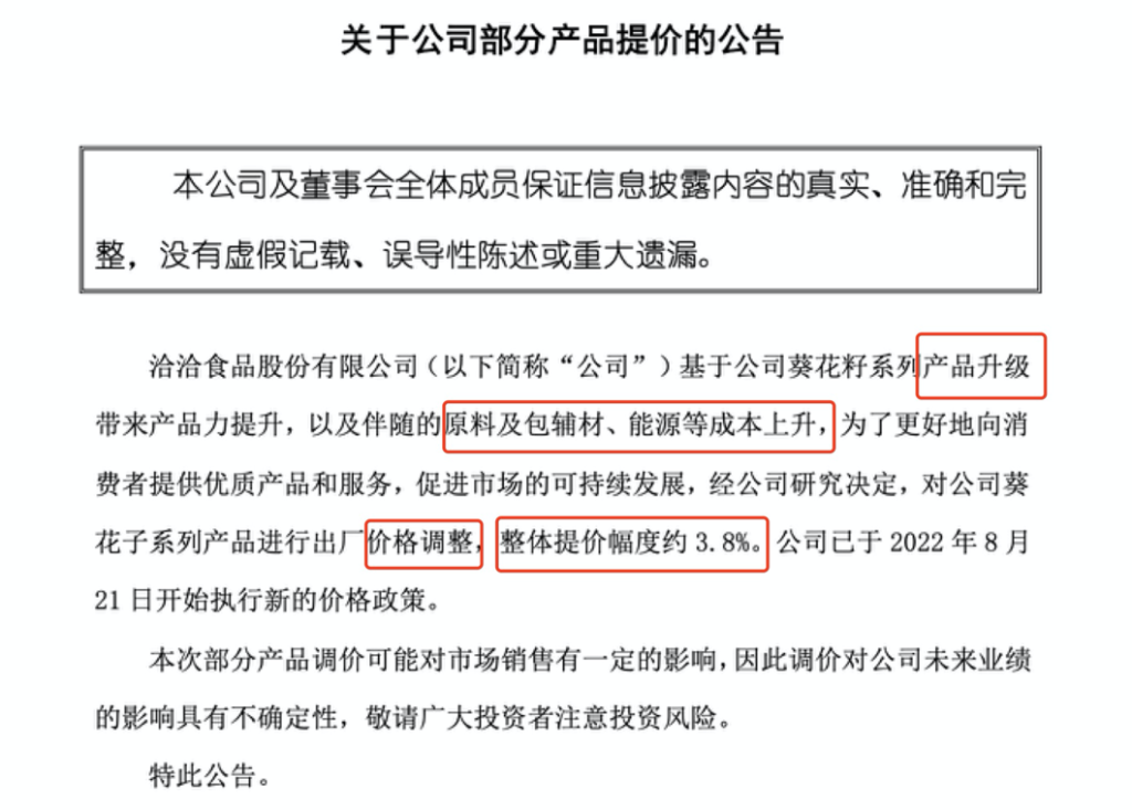 来源:洽洽食品关于公司部分产品提价的公告