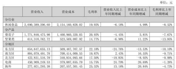 以洽洽为例,2025年中报指出,2024年内蒙葵花籽产区的连续阴雨直接导致原料霉变率升高、合格原料供给减少。同时,全球坚果原料的周期性波动也推高了采购成本。这种成本压力直接侵蚀了产品毛利率,成为影响行业利润水平的普遍因素。