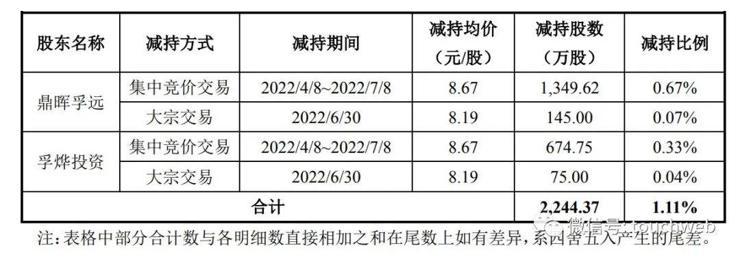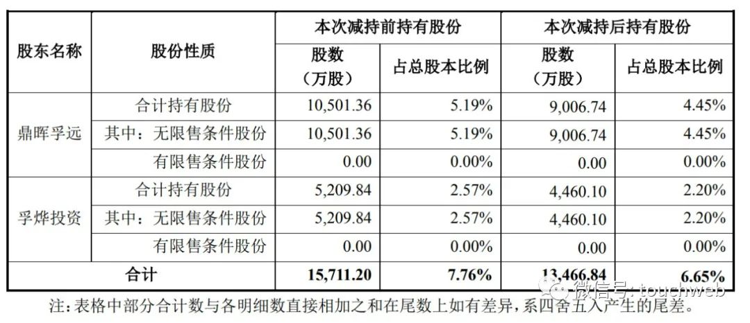 此次减持前,鼎晖孚远及孚烨投资一共持股为7.76%,鼎晖孚远及孚烨投资减持后一共持股为6.65%。