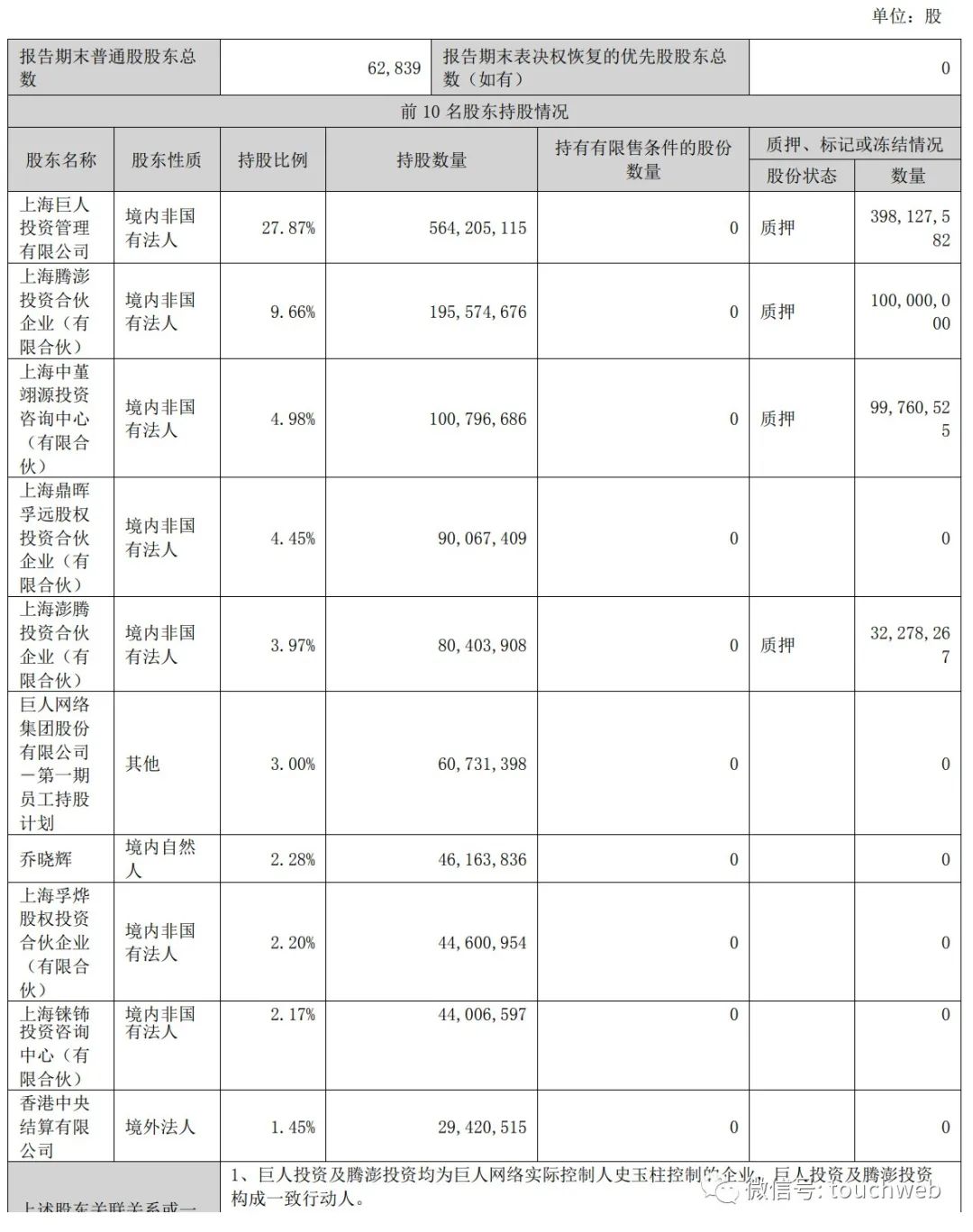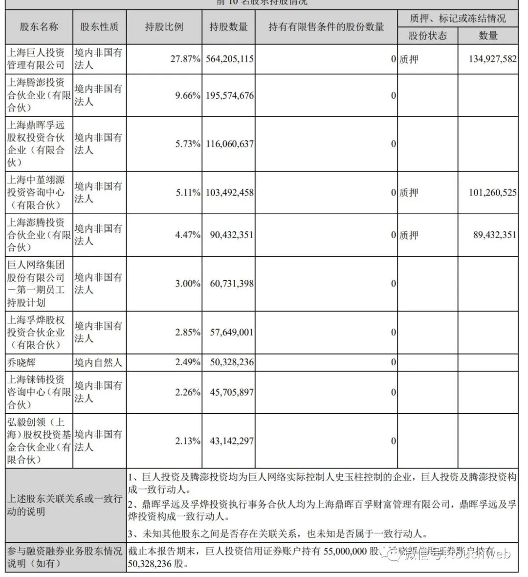 巨人投资及腾澎投资均为巨人网络实际控制人史玉柱控制的企业,巨人投资及腾澎投资构成一致行动人。史玉柱直接和间接控制巨人网络37.53%的股权。