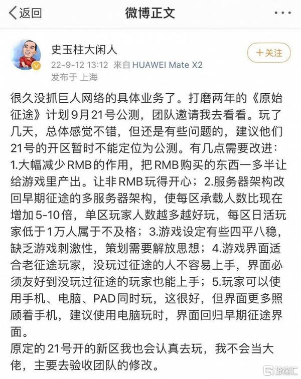 只有《原始征途》是个例外。今年9月,巨人网络旗下移动端战略新品《原始征途》宣布,原定于 9 月 21 日的公测延期,起因则是史玉柱在社交媒体上发出一条消息,表示:“很久没抓巨人网络的具体业务了。打磨两年的《原始征途》计划9月21号公测,团队邀请我去看看。玩了几天,总体感觉不错,但还是有些问题,建议他们21号的开区暂时不能定位为公测。”并随之对《原始征途》提出了多个意见,这也被外界视为史玉柱回归研发一线的信号。