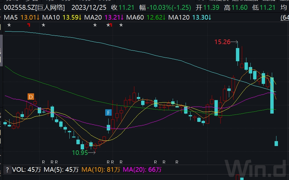 巨人网络上周五遭遇跌停,本周一(12月25日)再度跌停,连续两天跌停,最新股价11.21元/股,最新市值221亿元,两个交易日市值蒸发约52亿元。