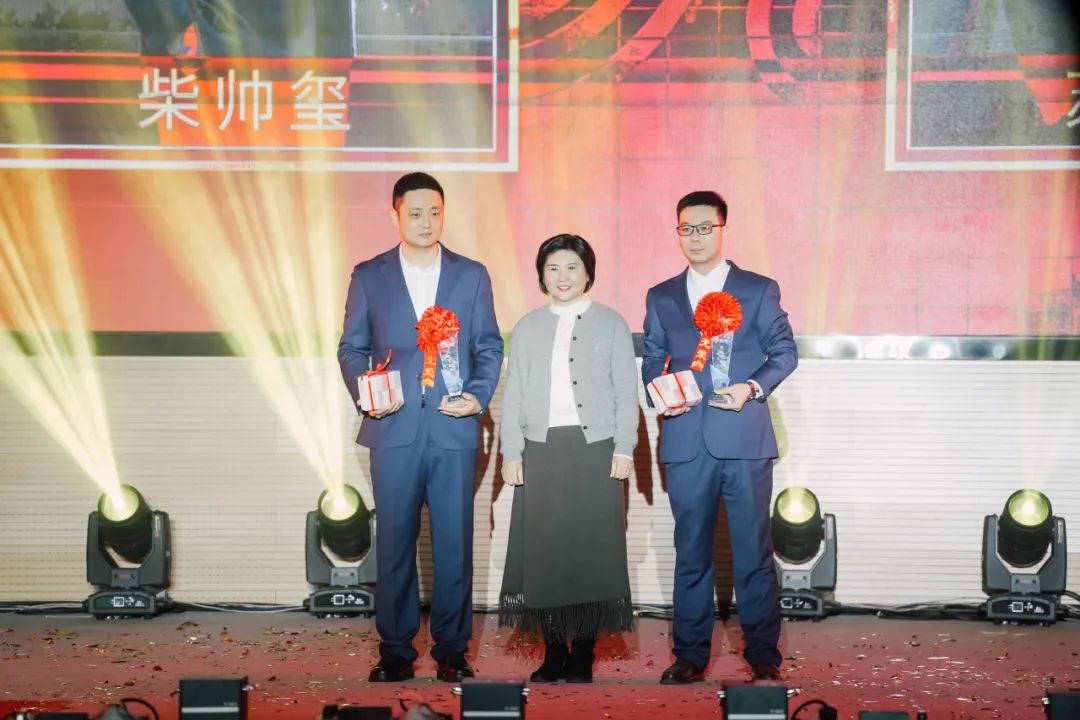 ▲河南通达电缆股份有限公司总经理曲洪普和通达新材总经理陈浩哲为获奖者颁奖、合影留念